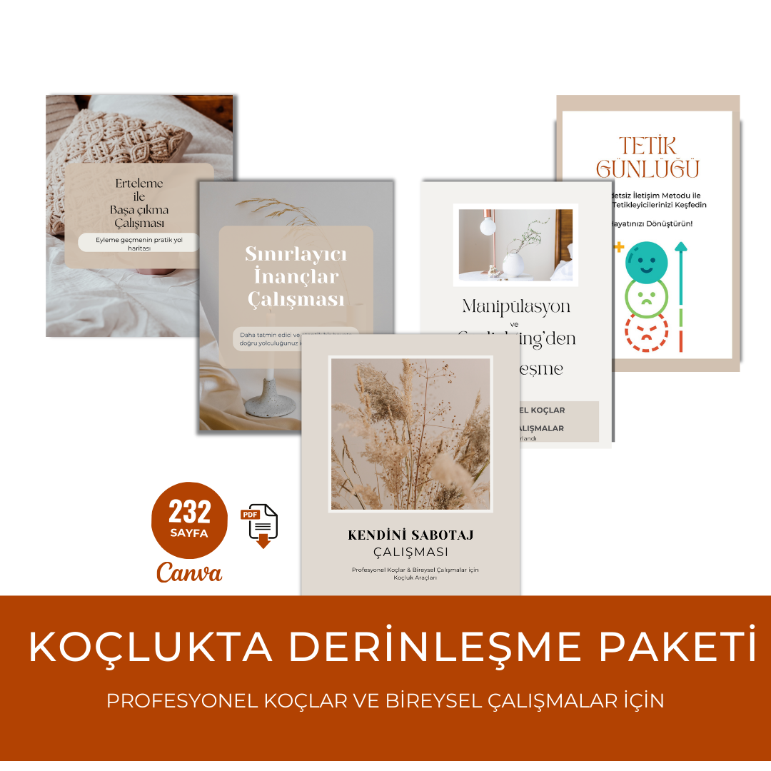 Koçlukta Derinleşme Paketi (Canva + PDF) Tetik Günlüğü, Sınırlayıcı İnançlar Çalışması, Erteleme Çalışması, Kendini Sabotaj Çalışması, Manipülasyon ve Gaslighting den Özgürleşme Çalışması
